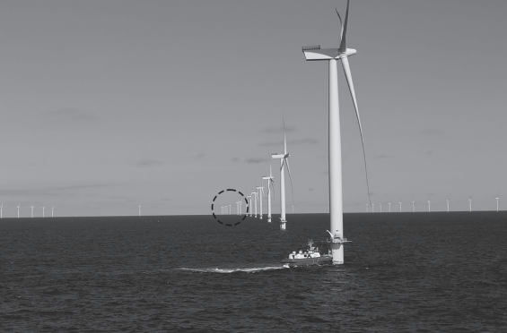 Os funcionários de uma usina eólica visitam diariamente as turbinas para realizar a manutenção. Em uma dessas visitas, eles perceberam que as sombras das turbinas projetadas sobre o mar mudam de posição ao longo do dia. Observe, na imagem abaixo, algumas dessas turbinas ao longo do horizonte.