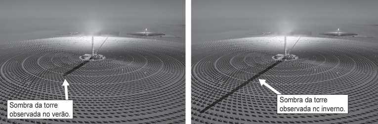 A usina heliotérmica utiliza a radiação solar para a geração de energia elétrica. A captação dessa energia é feita por espelhos que são instalados no solo, e as posições desses espelhos são controladas por uma torre de monitoramento. Observe, na imagem abaixo, essa usina no mesmo horário, mas em duas estações do ano diferentes.