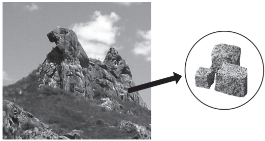 A Pedra da Galinha Choca é uma formação rochosa localizada no município de Quixadá, no Ceará. Essa formação recebe esse nome devido ao seu formato, que lembra uma galinha chocando ovos, sendo constituída de dioritos e granitos, que são rochas ígneas. Essas rochas se originam do resfriamento e da solidificação do magma e são compostas por diversos minerais, como quartzo, mica, silicatos e feldspato, que possuem alto grau de dureza e colorações variadas. Observe, na imagem abaixo, essa formação e o aspecto de uma dessas rochas em destaque.