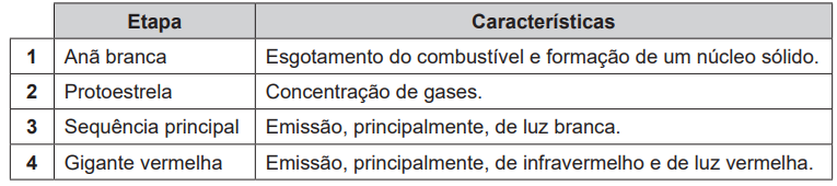 O Sol, assim como outras estrelas, apresenta um ciclo evolutivo. Na etapa de sequência principal desse ciclo, ele emite luz que permite a ocorrência do processo de fotossíntese. Esse processo é realizado por uma grande diversidade de seres vivos, como plantas, cianobactérias e algas, que surgem e se mantêm durante a etapa de sequência principal. Leia, no quadro abaixo, as etapas da evolução do Sol e algumas de suas características.