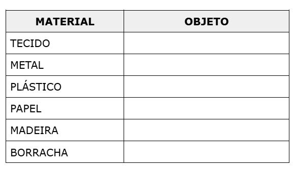 PREENCHA A TABELA A SEGUIR COM O NOME DE UM OBJETO QUE PODE SER ENCONTRADO EM SUA SALA DE AULA, QUE É FEITO COM OS MATERIAIS LISTADOS.