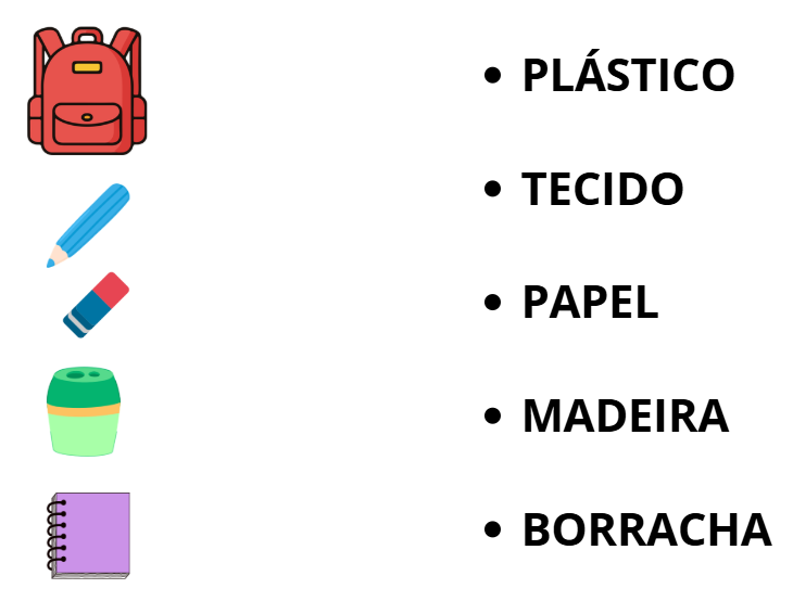 O PAPEL ESTÁ NOS CADERNOS, NOS LIVROS E NAS ATIVIDADES QUE USAMOS TODOS OS DIAS. O PLÁSTICO APARECE NAS CANETAS, NAS TAMPAS, NAS GARRAFAS E ATÉ NAS CAPAS DOS CADERNOS. A BORRACHA AJUDA A APAGAR OS ERROS E TAMBÉM ESTÁ PRESENTE NAS SOLAS DOS SAPATOS E EM ALGUNS BRINQUEDOS. A MADEIRA FORMA O TAMPO DE MESAS E AS PERNAS DE ALGUMAS CADEIRAS, ENQUANTO O METAL APARECE NOS GRAMPEADORES, TESOURAS E PARTES DAS MOCHILAS. JÁ O TECIDO ESTÁ NAS CORTINAS, NOS ESTOJOS E NAS ROUPAS QUE USAMOS.