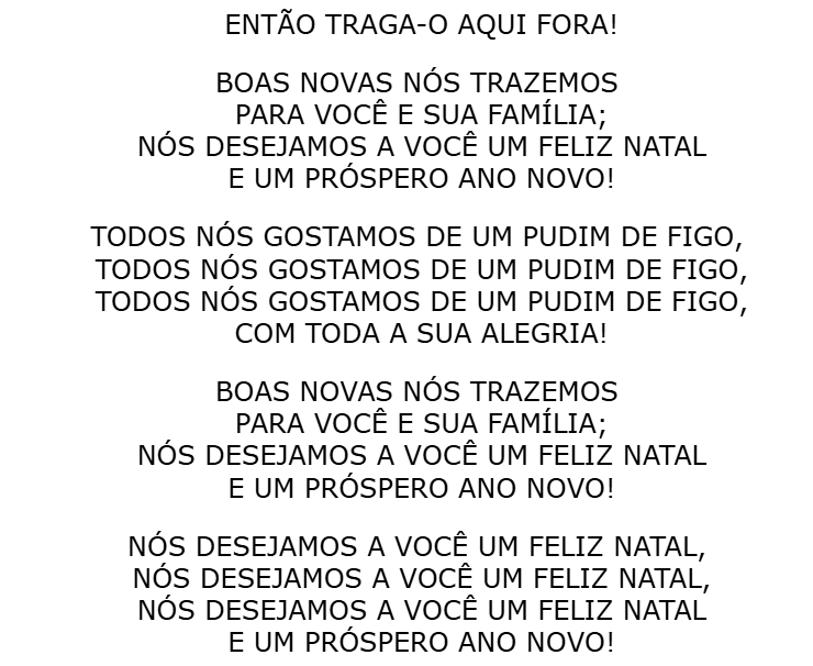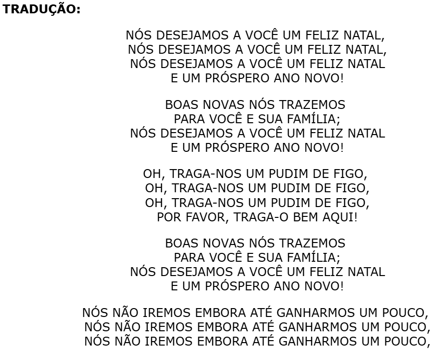 | Referências: | GOIÁS. Documento Curricular para Goiás – Ampliado. Volume II. Ensino Fundamental Anos Finais. CONSED; UNDIME, 2018. Disponível em <https://sme.goiania.go.gov.br/site/index.php/institucional/documentos-oficiais-2/category/27-documentos-gerais>>> Acesso em 15/12/2025. LOVE TO SING LIMITED. Christmas Songs & Carols, © 2025. Love to Sing. Disponível em: https://www.christmassongsandcarols.com/products/we-wish-you-a-merry-christmas-lyrics. Acesso em 11 dez. 2025. |