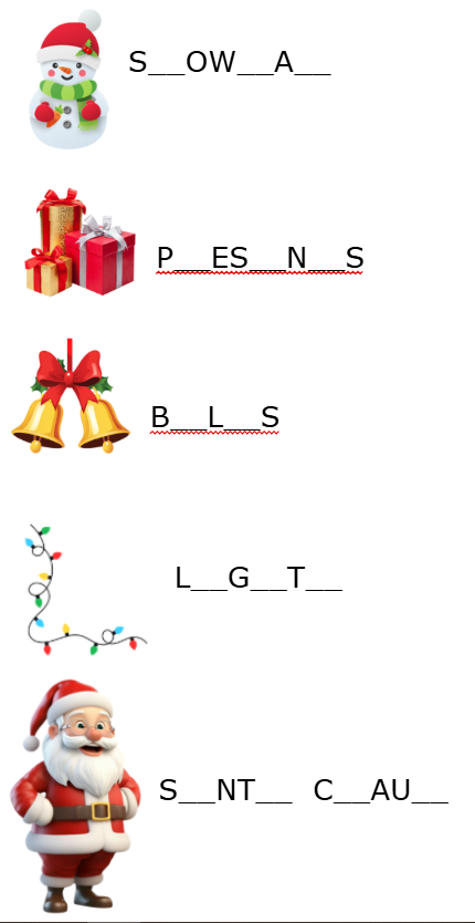 OBSERVE OS DESENHOS ABAIXO E COMPLETE COM AS LETRAS QUE FALTAM PARA DEIXAR OS NOMES CORRETOS.