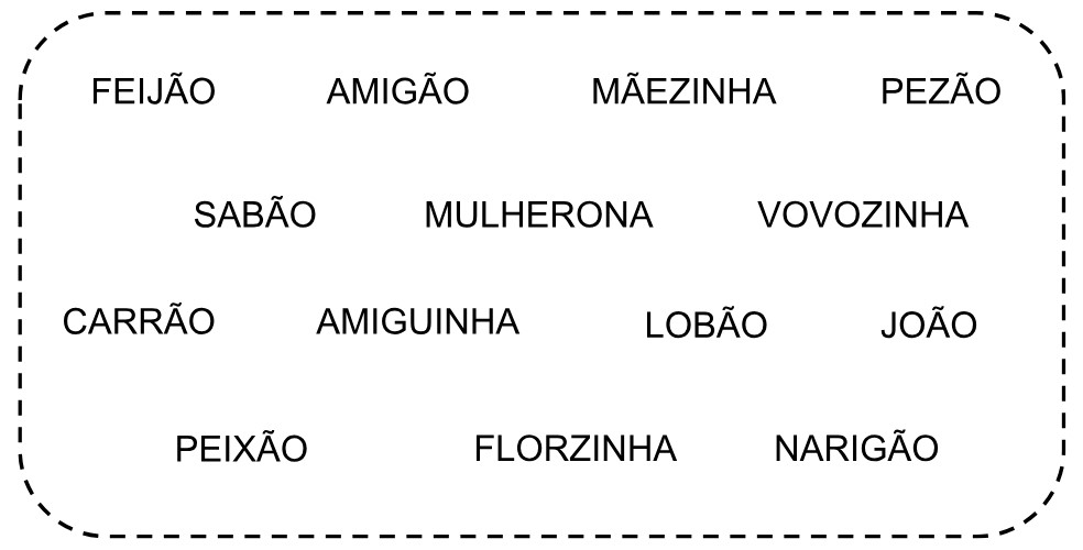 Habilidades: | (EF02LP11) Formar o aumentativo e o diminutivo de palavras com os sufixos -ão e -inho/-zinho. (EF02LP07) Escrever palavras, frases, textos curtos nas formas imprensa e cursiva.(EF12LP01) Ler palavras novas com precisão na decodificação, no caso de palavras de uso frequente, ler globalmente, por memorização. |