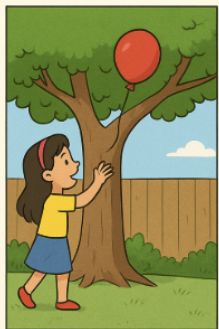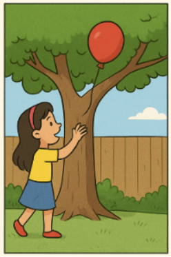 Lila acordou cedo e viu, pela janela, um balão vermelho preso na árvore do quintal. Curiosa, ela correu até lá e tentou alcançar o balão, mas não conseguiu.