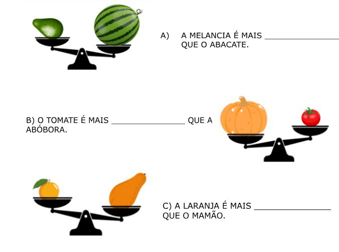 OBSERVE AS BALANÇAS E COMPLETE CADA FRASE COM A PALAVRA LEVE OU PESADA.