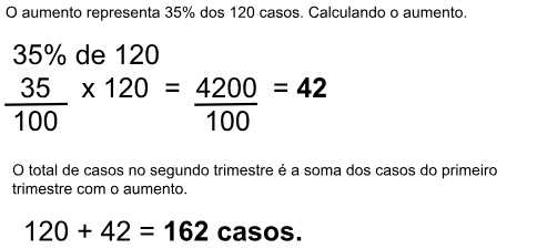 Exemplo 1: No primeiro trimestre do ano, foram registrados 120 casos de gastroenterite. No segundo trimestre, houve um aumento de 35%. Quantos casos foram registrados no segundo trimestre?