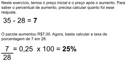Exemplo 2: O pacote de 1kg de café que custava R$ 28,00, teve reajuste e passou a custar R$35,00. Qual foi o percentual de aumento?
