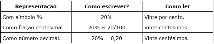 Exemplo: 20% = 20/100.