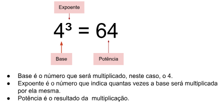 Por exemplo, ao contrário de escrever 4 x 4 x 4, podemos usar a notação de potência, 4³.