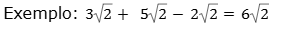 1. Adição e Subtração: a adição e a subtração se dá por semelhança. Por isso, somar ou subtrair números em que os radicais sejam exatamente iguais (mesmo radicando e mesmo índice de raiz).
