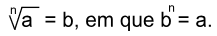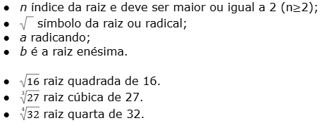Chamamos de raiz de um número a qualquer, a base b que, multiplicada por ela mesma, na quantidade de vezes determinada pelo índice (n) da raiz, seja igual a a.